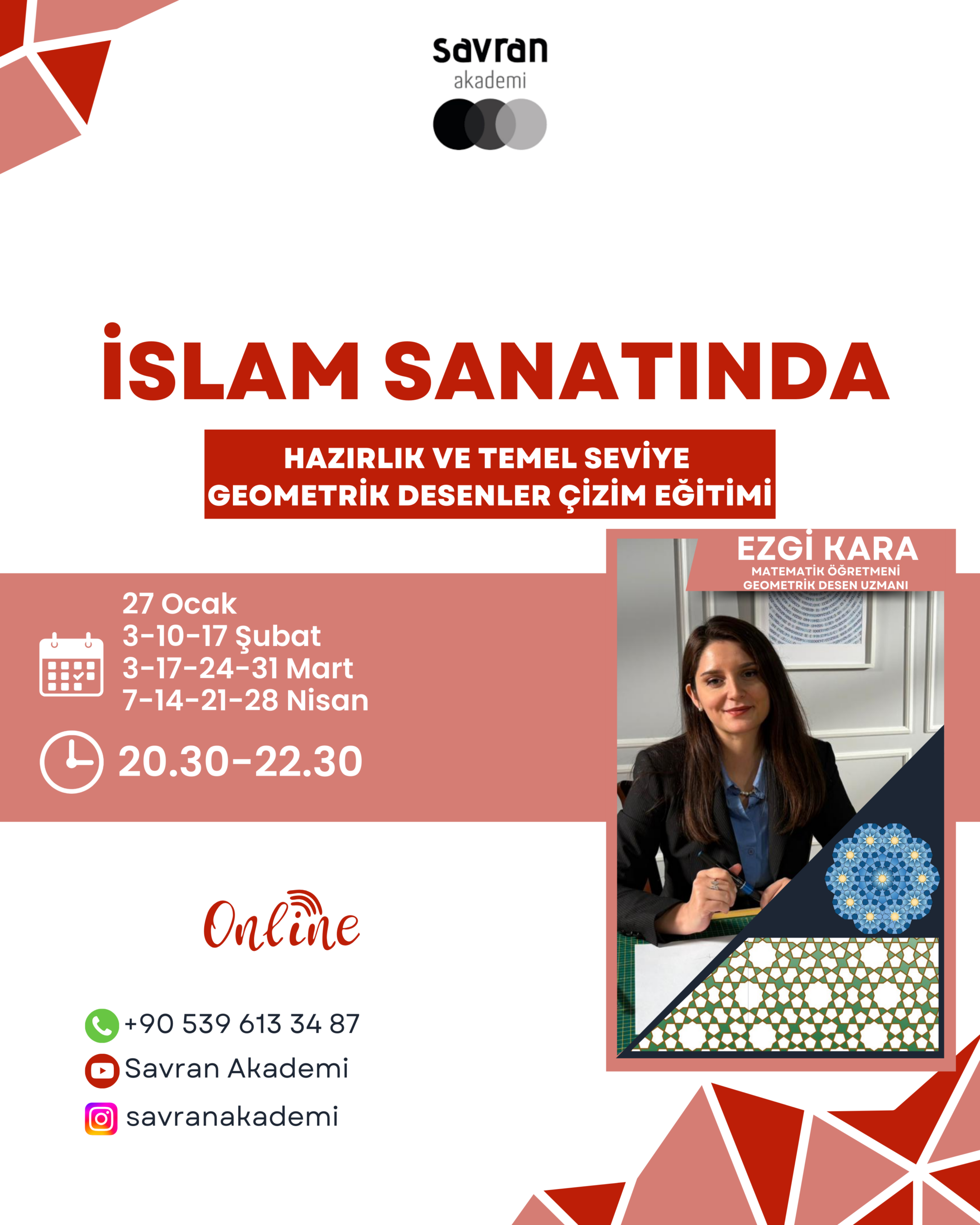 Pergel ve cetvel kullanarak icra edilen geometrik desen sanatı, belirli bir matematiksel düzen ve teknik bilgi gerektirir. Savran Akademi ile e-devlet onaylı yeni dönem eğitimleri başlıyor. Bu köklü sanatın metodolojisini temel prensiplerden ileri seviye uygulamalara kadar kapsamlı bir müfredatla sunuyoruz.